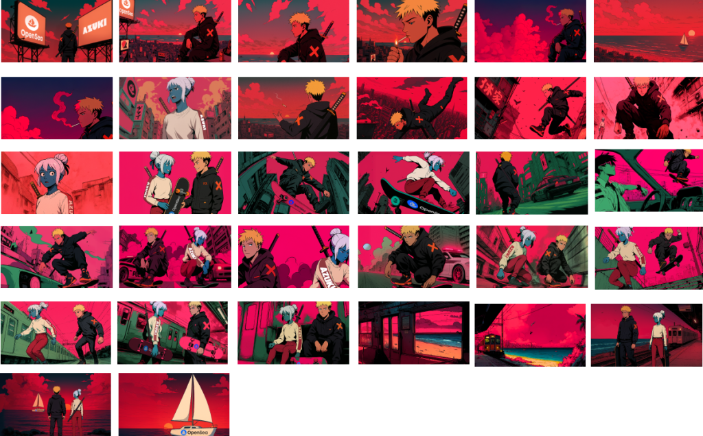 Led the concept and execution of a short-form animated film for the OpenSea NFT Art Contest, blending anime-inspired cinematics with skate culture to create a high-energy, narrative-driven take on the Azuki brand. Defined the story, dialogue, and storyboard while establishing a clear art direction that balanced stylized motion with grounded, street-level energy. Collaborated with Vincent Bowman (Man 3 Faces) on audio and voice to deliver a cohesive, multi-sensory final piece.