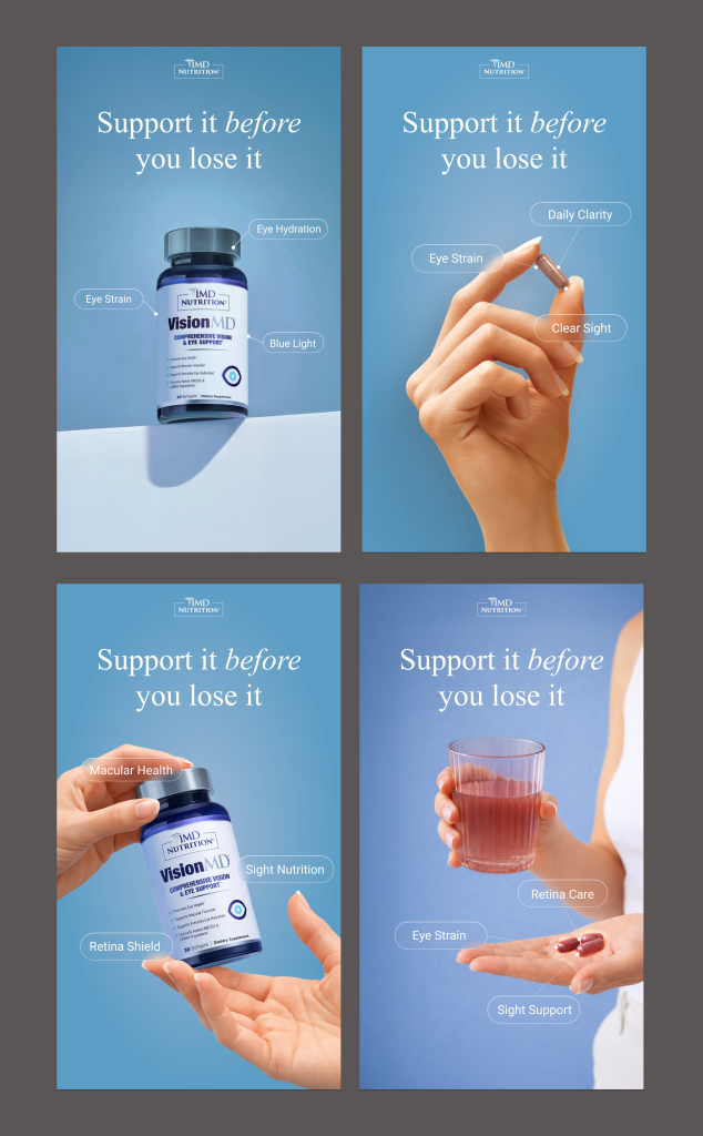 This campaign for VisionMD positioned the product as proactive eye support encouraging daily care before symptoms arise. The visual direction balanced clinical credibility with a modern, calming aesthetic to communicate trust, clarity, and long-term protection.