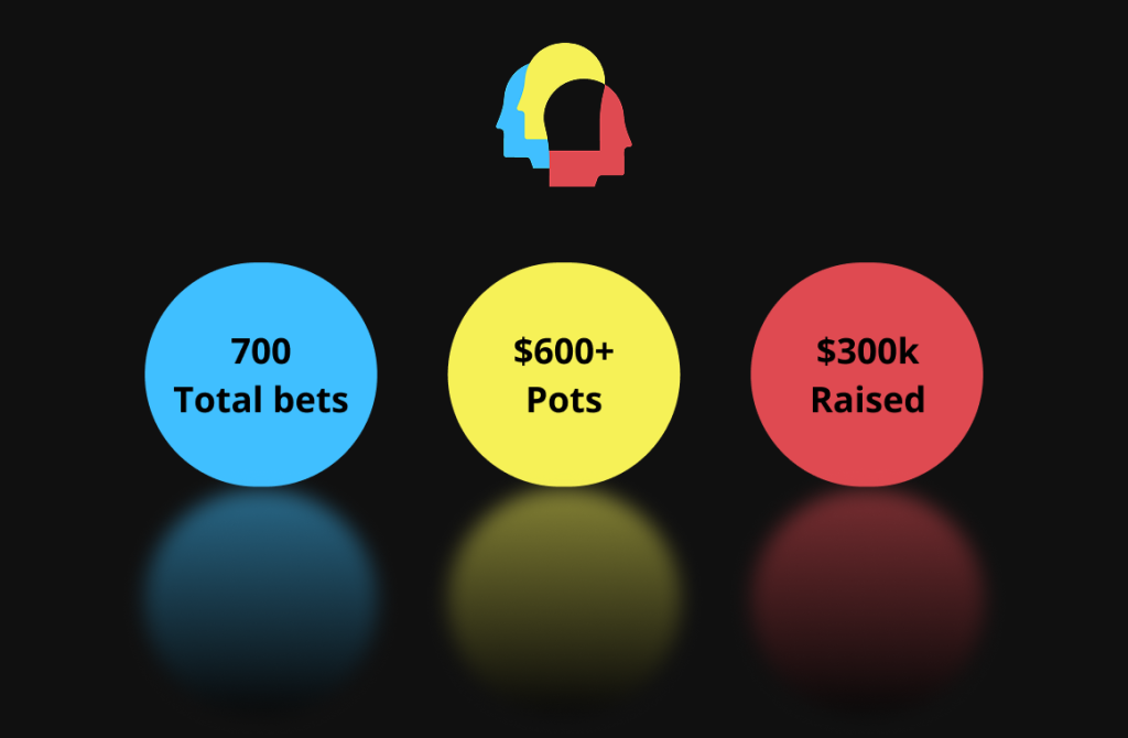 Showcasing total bets placed, pot sizes generated, and capital raised during the prototype phase. It gives a quick snapshot of growth, engagement, and the momentum behind the platform.