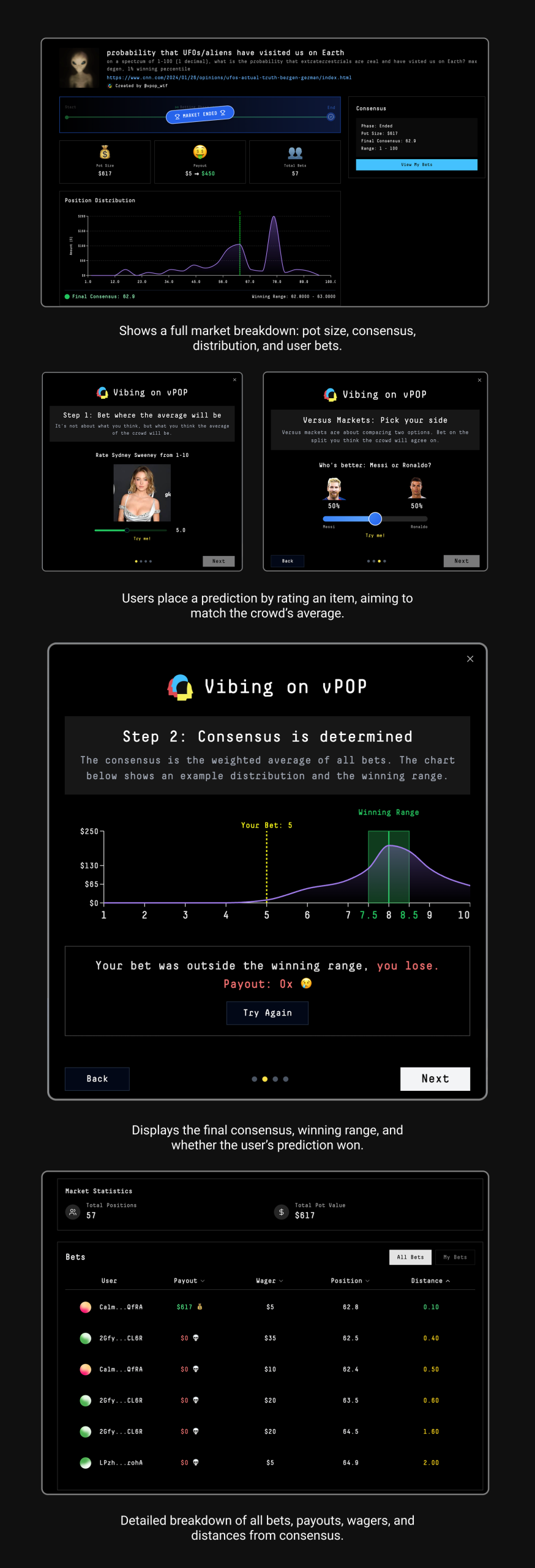 Overview: vPOP is a sentiment-driven prediction experience that turns collective opinion into a market you can actually play with. Instead of guessing objective outcomes, users try to predict where the crowd average will land whether rating a celebrity, choosing between two icons, or estimating probabilities on trending topics. Through a playful, high-contrast interface and a simple commit-reveal flow, vPOP transforms abstract math into an intuitive, almost game-like interaction. Users place a bet, the market calculates a weighted consensus, and the closest percentile wins the pot. My role focused on designing the full user journey onboarding, rating screens, versus markets, consensus visualization, payout states, and data-heavy market dashboards while keeping everything clear, fast, and fun. The result is a uniquely social market experience that blends prediction mechanics, crowd psychology, and clean UX into something instantly understandable and addictive.