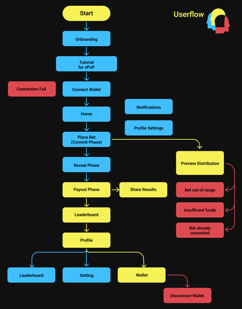 Userflow: I designed the user flow to make vPOP instantly understandable guiding users through placing a bet, revealing the consensus, and seeing outcomes with as little friction as possible. Every step is focused on clarity, pacing, and making a new market mechanic feel natural and intuitive.