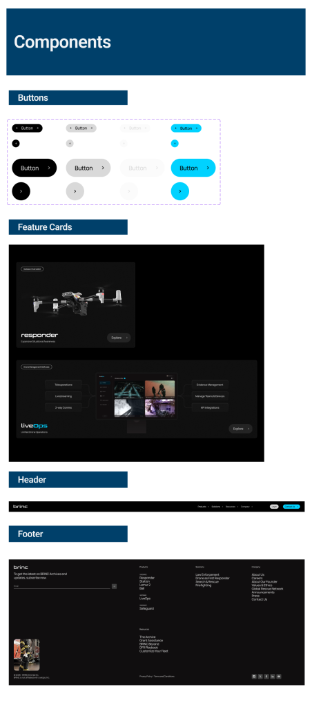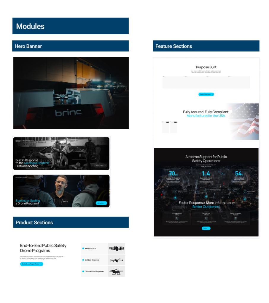 To improve consistency and scalability across the BRINC website, I developed a modular design system used for marketing pages, product pages, and landing experiences.